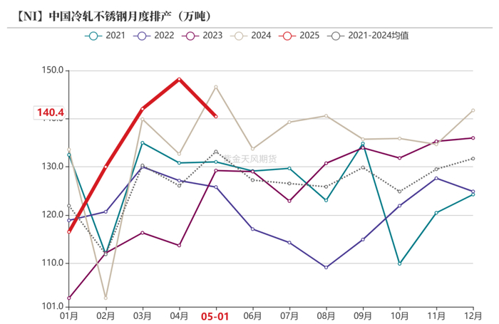 不锈钢排产:偏多 截至2025年5月,全国冷轧不锈钢月度排产环比减少7.76万吨至140.4万吨,环比减5.24%。