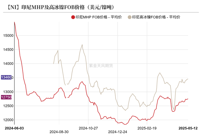 上周MHP FOB价格环比增加104美元/吨至12753美元/吨,环比增0.82%;高冰镍FOB价格环比增加144美元/吨至13460美元/吨,环比增1.08%。