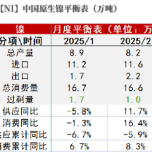 截至2025年3月,全国镍矿累计进口量359.33万吨,同比减5.22%。