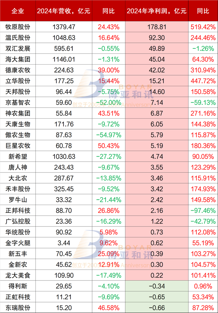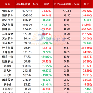 2024年,以牧原股份、温氏股份为代表的上市猪企,营业收入、净利润同比均实现较大幅度增长。