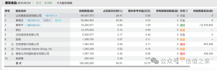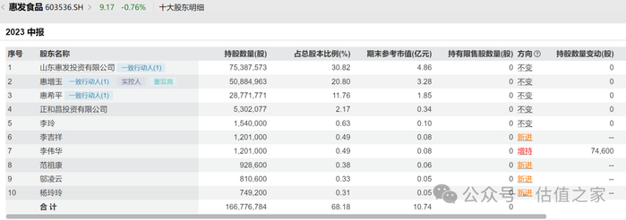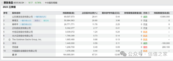 2023年7月19日,惠发食品发布公告,宣称因客观条件变化,未能与上述私募基金达成《股份转让协议》。协议的终止未能改变实控人及其一致行动人减持股份的初心,随后半个月,惠发食品股价突然毫无征兆的拉出3个涨停板,从不到7元/股最高涨到超过10元/股。紧接着2023年8月31日,惠发食品发布公告称,大股东山东惠发投资有限公司拟按7.48元/股的价格,向张增平转让5,880,000万股,占公司股本总额的2.40%,转让金额约4400万元。然而从2023Q3股东名单来看,张增平并未出现在前十大股东名单当中,也就是2023年9月份短短一个月,2.40%的总股本基本被张增平减持完毕,而2023年9月惠发食品的股价最低点为7.75元/股,应该是赚了不少。