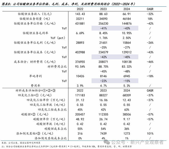 公司围绕钴酸锂与NCM三元材料构建双轮驱动格局。分别对应消费电子及动力电池两大核心应用方向。2021年,公司营收重心仍以钴酸锂为主,占比达72%。2022年起,三元材料业务快速崛起,主要受益于下游中创新航等客户放量,占比提升至47%;钴酸锂占比降至50%,公司产品结构实现重大优化。2023~2024年,随着下游客户新项目量产导入,公司三元材料销量持续攀升,两大业务占比基本持平,钴酸锂近50%、三元材料近45%,业务结构更趋均衡,助力公司在高景气周期下持续受益。