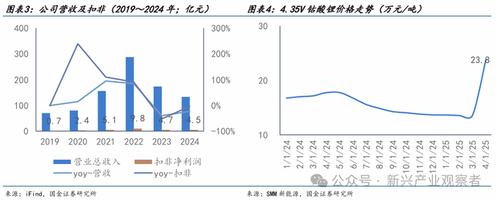 主业稳健,2023~2024年下滑主要系原材料价格波动。2019~2022年,公司营收、扣非利润均呈现增长态势,2023年以来营收同比呈现下降主要系锂、镍、钴等主要原材料价格下滑,扣非净利2024年降幅明显收窄,逐步企稳。