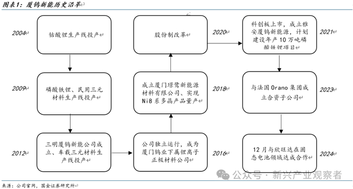 公司前身为世界钨行业领军企业厦门钨业旗下的电池材料事业部,从2002年起,公司陆续投入重金建立了钴酸锂、锰酸锂、三元材料及磷酸铁锂等生产线,2016年12月从母公司分立,设立新公司独立运行,2020年完成股份制改革,2021年于上交所科创板上市,2023年1月与盛屯矿业集团等成立合资子公司,建成高镍、高电压三元前驱体生产线,同年5月与法国Orano集团成立合资子公司,以满足海外客户需求,加速锂电企业出海,为国内钴酸锂正极材料龙头企业。