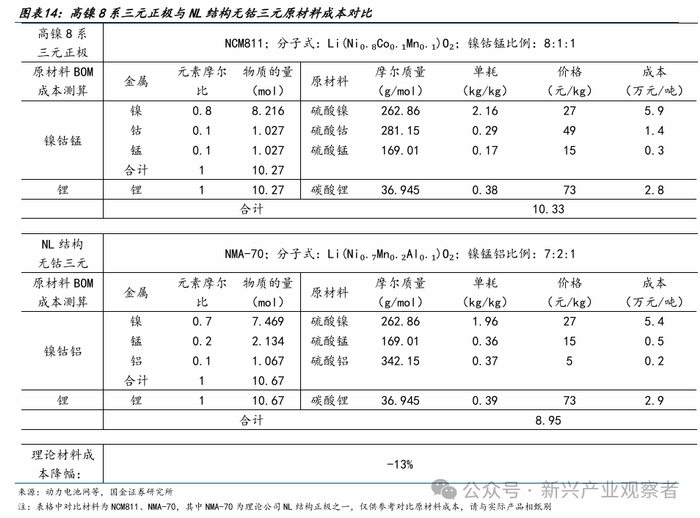 新技术有望实现降本增效:新型NL层状结构正极材料与既有的正极材料产线不通用,需要重新设计或改造生产线,将导致公司在产业化初期投入较高的成本。在正极材料的构成元素中,镍通过多价态变化提供更多锂离子存储位点,显著提高比容量,但会加剧阳离子混排;钴能抑制阳离子混排,维持锂离子的扩散通道。NL结构通过定向嵌入锂离子以增加锂离子含量及利用率,减少对镍元素的依赖,同时更宽的层间距能够保证锂离子的扩散,减少对钴元素的依赖。NL结构材料能用廉价金属替代部分贵金属如镍、钴等;钴酸锂中钴金属成本占比近80%,三元材料中钴、镍金属占比近60%,减少钴、镍金属使用量将大幅降低正极材料成本。以三元材料为例,考虑NCM811(分子式:Li(Ni₀.₈Co₀.₁Mn₀.₁)O₂)对比NMA-70(分子式:(Li(Ni₀.₇Mn₀.₂Al₀.₁)O₂),经测算,NL结构三元正极在用铝替代钴的情况下,原材料成本降幅10%~15%。考虑到目前NL结构尚处于产业化初期,良品率和生产效率未达最优,初期导入成本预计较高;综合考虑正极材料成本中直接材料成本近80%~90%,伴随工艺成熟,NL结构正极成本有望占据优势。