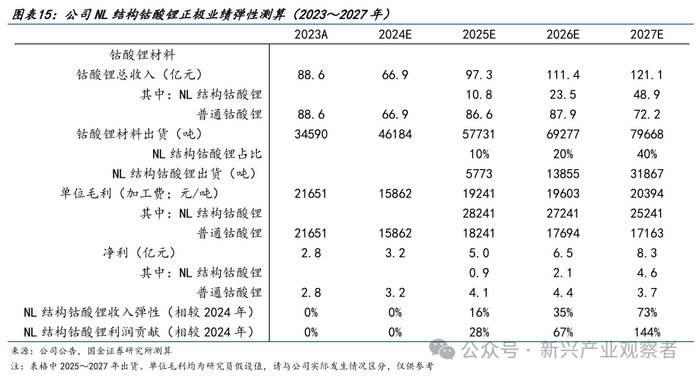 得出结果:2025~2027年,① NL结构钴酸锂净利贡献:0.9~4.9亿元;② NL结构钴酸锂业绩弹性:收入、利润预计分别16%~73%、28%~144%,相较2024年。