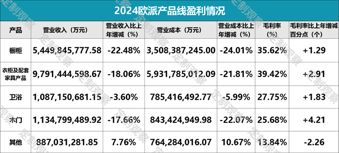 2024年,欧派橱柜、衣柜、卫浴及木门等四大业务营收均呈现出不同程度的下滑,仅有其他产品营收同比上升。