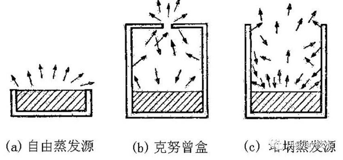 在蒸发沉积方法中常使用的克努森盒(Knudsencell),相当于一个面蒸发源。它是在一个高温坩埚的上部开一个直径很小的小孔。在坩埚内,物质的蒸气压近似等于其平衡蒸气压;而在坩埚外,仍保持着较高的真空度。与普通的面蒸发源相比,它具有较小的有效蒸发面积,因此它的蒸发速率较低。但其蒸发束流的方向性较好。最为重要的是,克努森盒的温度以及蒸发速率可以被控制得极为准确。