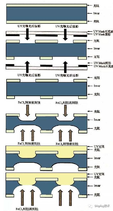 生产FMM的方式主要有三种,即蚀刻(DNP FM)、电铸(electroforming FM)和多重材料(金属+树脂材料)复合。以下即为蚀刻方式FMM制作工艺流程图。