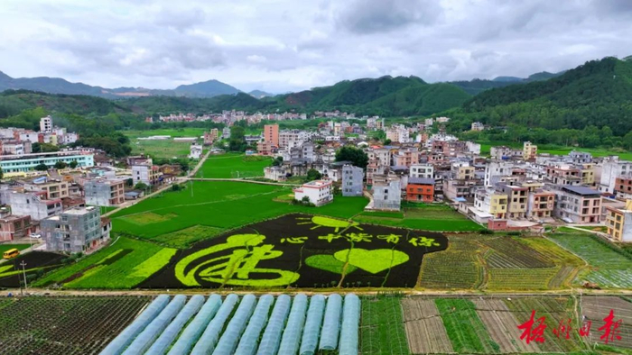 5月9日,岑溪市马路镇福塘村的家庭农场稻田画在村庄民居的衬托下格外美丽。该稻田画面积12亩,分别种植了紫米和黄米水稻,是当地的乡村文旅网红打卡点。 庞广蛟 黄红丽 摄
