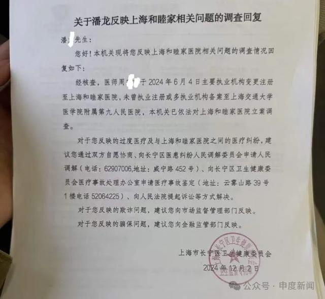 长宁区卫生健康委员会(下简称“长宁卫健委”)在2024年12月2日向潘先生出具的回复指出: