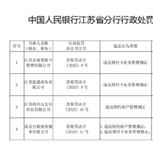 因违反预付卡业务管理规定、特约商户管理规定 江苏四家公司被罚