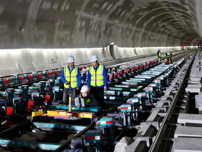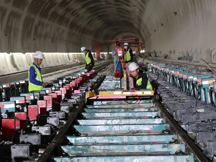 项目施工全程融入科技元素,推动“人力施工”向“智慧管控”转型。其中,无砟轨道智能工装:智能化分枕平台让轨枕分拣效率提升50%,人员从8人减至6人;动力轨排精调系统实现“一键自动校准”,100米精调时间缩短2小时,精度达毫米级。