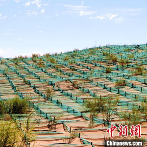 中新网兰州5月13日电 (马爱彬)“气流流经20厘米高度范围内的沙障时,障前、障顶、障中及障后形成风速差异,减速区通过损耗风能,实现固沙与阻沙效果。”5月上旬,在甘肃武威市民勤县城西大河小井子的“近自然仿生学”造林项目现场,民勤县勤锋林业实验站高级林业工程师许芳荣与同事测量沙障规格后,依据自然场地条件,以水定林,量水而行,在沙障内低覆盖度栽种梭梭、毛条、沙拐枣等耐旱抗风沙树种。