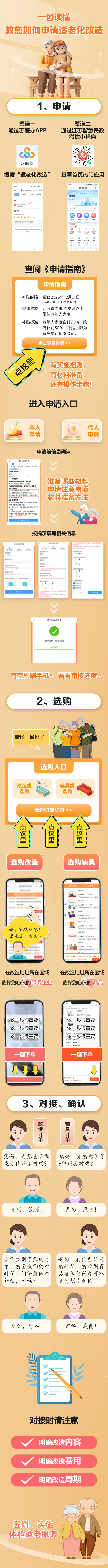 如何参与这次居家适老化改造活动?老年人及家庭通过“江苏民政”微信公众号——“微服务”——“居家适老化改造”移动端应用或“苏服办”APP——“居家适老化改造”移动端应用提出购置申请。按要求上传老年人身份证、拟改造住房的房产证明(不动产权证、宅基地权属证、购房协议或村居居住等相关证明),并提交老年人家庭改造申请承诺书;老年人租住他人房屋或居住子女、亲属房屋的,如申请居家适老化改造,还需获得所居住房屋产权人的授权。只购买适老辅具的老年人,只需要上传本人身份证、老年人购买适老辅具申请承诺书即可。