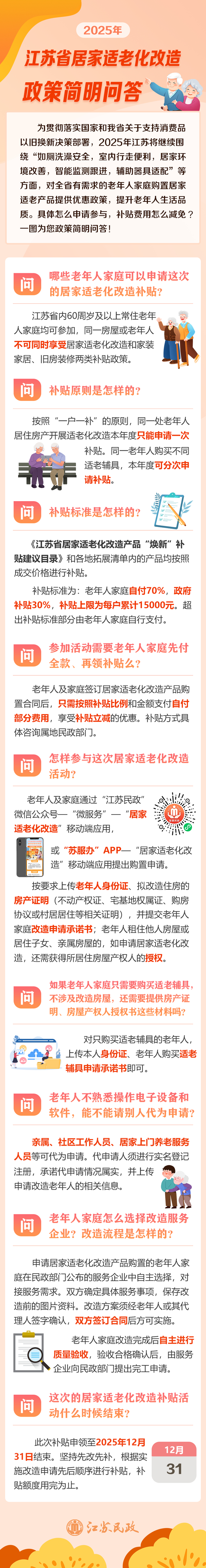 扬子晚报网5月13日讯(记者 董婉愉 闫春旭)记者今日从江苏省民政厅获悉,2025年居家适老化改造产品“焕新”行动开始啦!即日起至2025年12月31日,江苏省内60周岁及以上常住老年人家庭购置居家适老产品享受优惠政策,补贴品类覆盖7大类68小类,补贴金额最高可达15000元,快帮爸妈申请!