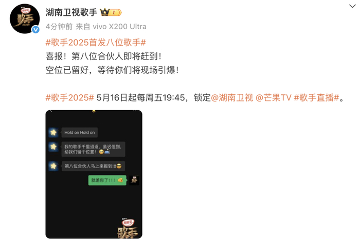 5月13日,@湖南卫视歌手 发文宣布《歌手2025》将有8位首发歌手:“喜报!第八位合伙人即将赶到!空位已留好,等待你们将现场引爆!”