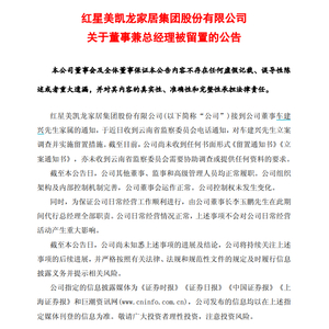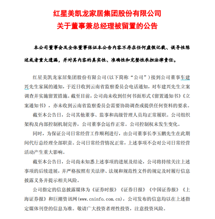 今日晚间,红星美凯龙家居集团股份有限公司(以下简称“美凯龙”)发布公告称,公司董事兼总经理车建兴近日收到云南省监察委员会电话通知,对其立案调查并实施留置措施。