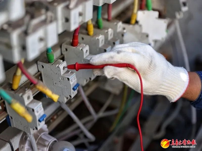 5月13日,在沙依巴克区平顶山街道金沙江路,工作人员在检修配电柜电路。