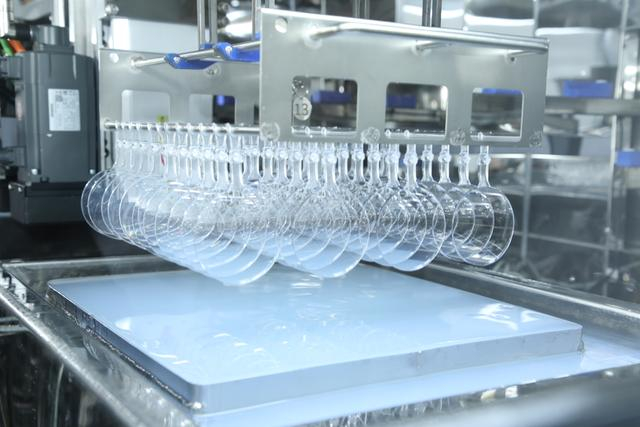 “这些刚压好的镜片,我们叫基片。”周博解释道。刚压制好的基片很脆弱,一碰就废。基片降温后,再由人工送至加工车间,机器人将基片放入纯水清洗。基片由PC材料制成,不耐酸不耐碱,用纯水清洗,可以保证其洁净度。