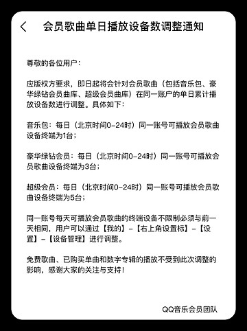 4月20日,QQ音乐方面发布重要服务调整公告,宣布自即日起将对会员的单日累计播放设备数量进行限制,其中音乐包用户仅限1台设备播放、豪华绿钻会员为3台、超级会员则可享5台。