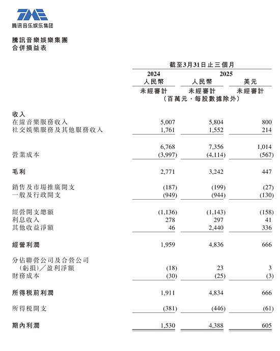 北京时间5月13日港股盘后、美股盘前,腾讯音乐发布了2025年一季度财报。