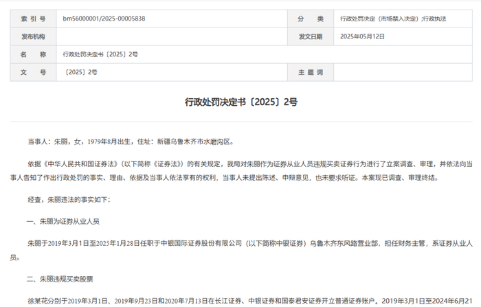 5月12日,证监会新疆监管局发布公告称,中银证券时任财务主管朱丽因违规买卖证券行为受到行政处罚。