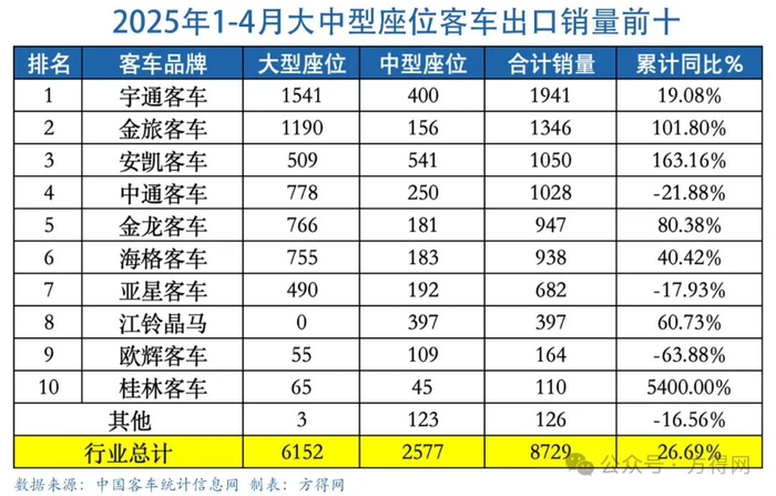 传统客车强企主力阵容——大中型座位客车,2025年1-4月出口8729辆、同比增长26.69%。其中4月大中型座位客车共计出口2427辆、同比增长5.75%。