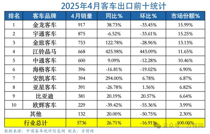 2025年4月出口客车(车长3.5米以上)5736辆,同比增长26.71%、环比下降16.91%!