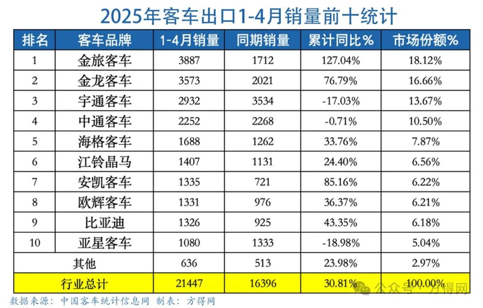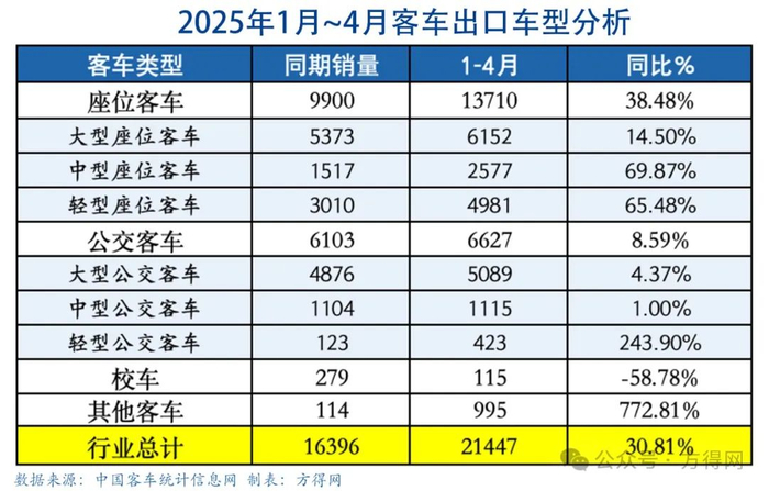 2025年1~4月,客车出口销量21447辆、累计同比增长30.81%!以4个月时间突破出口2万辆!