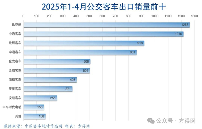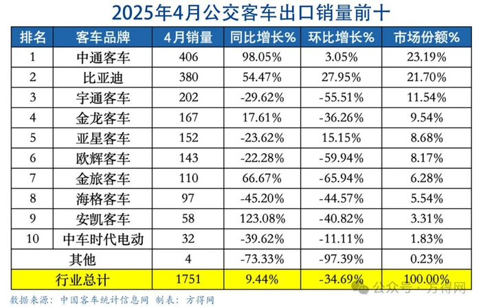 2025年4月,公交客车出口1751辆,环比下滑34.69%、同比小增9.44%。行业前十再度重排!