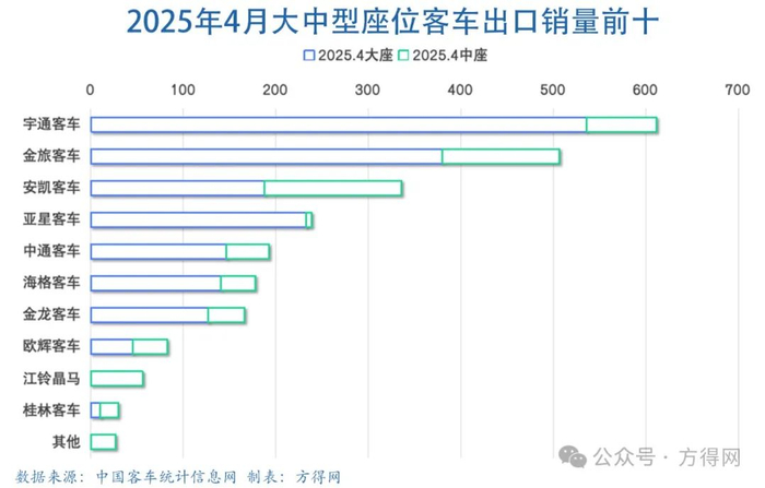 排名4月大中型座位客车出口前十的分别为:宇通客车、金旅客车、安凯客车、亚星客车、中通客车、海格客车、金龙客车、欧辉客车、江铃晶马和桂林客车。