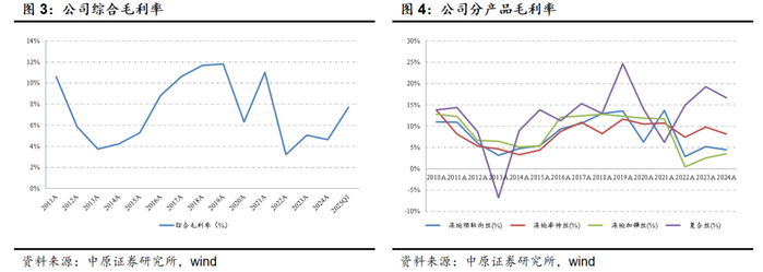 涤纶长丝产销增长,浙石化盈利提升推动业绩增长。2024年纺织服装内需温和增长,公司涤纶长丝产销实现较快增长,加上参股浙石化带来投资收益的提升,共同推动了业绩的增长。全年涤纶长丝产量1281.89万吨,同比增长22.41%,销量1297.81万吨,同比增长25.46%。其中POY销量968.2万吨,增长23.44%,FDY销量214.12万吨,增长45.72%,DTY销量111.96万吨,增长12.64%。价格方面,全年涤纶长丝售价总体平稳,2024年平均售价6904元/吨,同比下滑1.98%。其中POY均价6632元/吨,下滑2.14%,FDY均价7408元/吨,下滑2.63%,DTY均价8283元/吨,下滑0.19%。受益于长丝产销的增长,公司全年化纤业务收入925.12亿元,同比增长23.45%,推动了全年营收的增长。盈利能力方面,2024年公司化纤业务毛利率4.89%,同比下降0.71个百分点,综合毛利率4.64%,同比下降0.42个百分点,总体保持平稳。在收入增长的推动下,全年主业实现毛利47.03亿元,同比增长12.38%。
