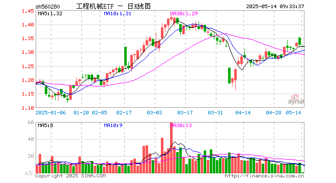 5月14日,工程机械ETF(560280)开盘跌0.38%,报1.320元。工程机械ETF(560280)重仓股方面,潍柴动力开盘涨0.07%,三一重工跌0.25%,徐工机械跌0.11%,恒立液压跌0.24%,中联重科跌0.13%,柳工跌0.10%,江淮汽车涨0.25%,安徽合力跌0.35%,杭叉集团涨0.30%,中铁工业涨0.13%。