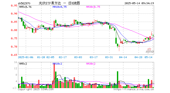 5月14日,光伏ETF易方达(562970)开盘跌0.90%,报0.769元。光伏ETF易方达(562970)重仓股方面,隆基绿能开盘跌0.90%,阳光电源跌1.49%,TCL科技跌0.23%,特变电工跌0.50%,通威股份跌1.91%,TCL中环跌0.99%,晶科能源跌0.34%,正泰电器涨0.04%,德业股份涨0.00%,晶澳科技跌1.08%。