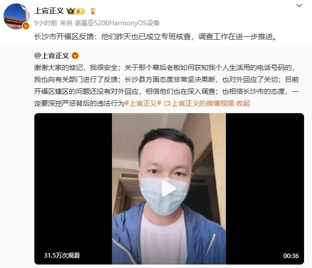 5月13日,上官正义发文称,关于那个幕后老板如何获知我个人生活用的电话号码的,我也向有关部门进行了反馈;长沙县方面态度非常坚决果断,也对外回应了关切;目前开福区辖区的问题还没有对外回应,相信他们也在深入调查;也相信长沙市的态度,一定要深挖严惩背后的违法行为。
