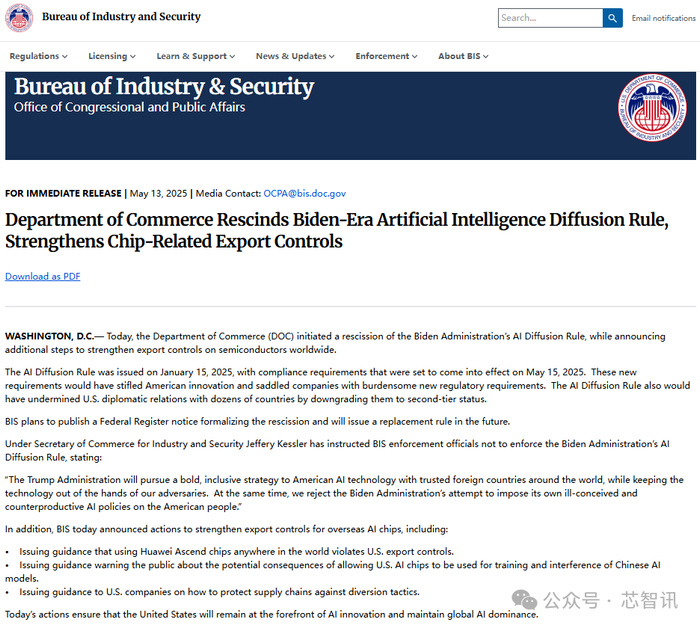 当地时间5月13日,美国商务部工业和安全局(BIS)发布公告称,启动撤销拜登政府的《人工智能扩散规则》(Intelligence Diffusion Rule),同时宣布采取额外的措施加强全球半导体出口管制。