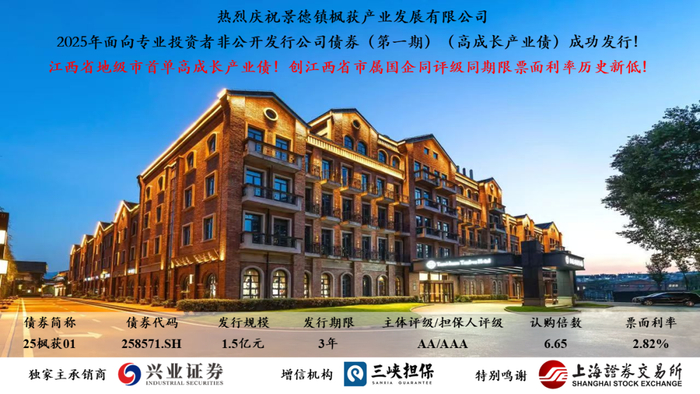 近日,由兴业证券担任独家主承销商的“景德镇枫荻产业发展有限公司2025年面向专业投资者非公开发行公司债券(第一期)(高成长产业债)”在上交所成功发行,为江西省地级市和我司首单高成长产业债,发行规模为1.5亿元,期限为3年,票面利率2.82%。