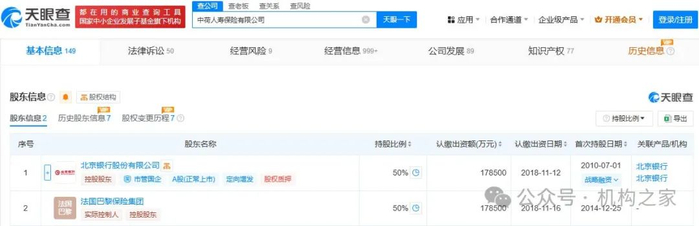 据天眼查显示,总部位于辽宁省大连市的中荷人寿,目前由北京银行和法国巴黎保险集团共同持股、各占50%。事实上,中荷人寿现任董事长王健也出身于北京银行,此前曾担任该行副行长。