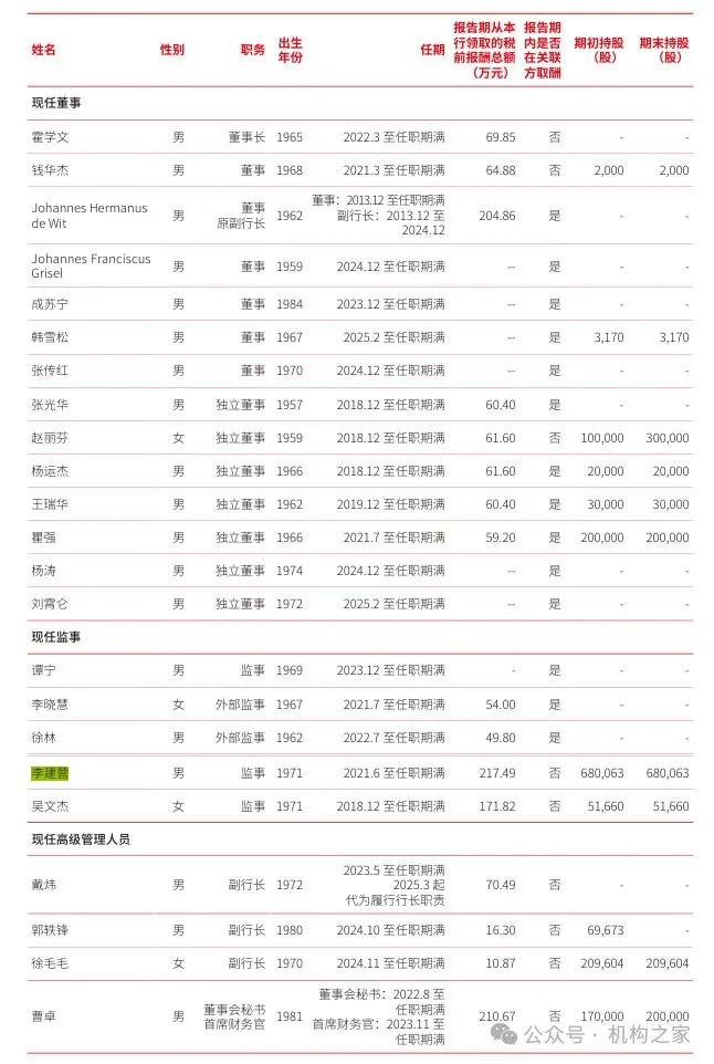 注:2024年北京银行高管团队薪酬情况一览;