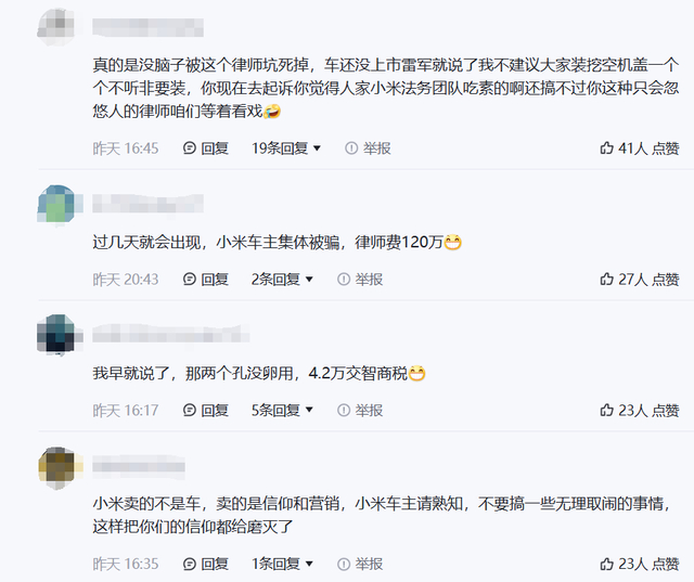 于是,当400多名车主成立集体维权,并“众筹”律师费的时候,评论区就不再是支持的声音,甚至有人直言车主们就是被律师忽悠了,因为自己当初仔细听了发布会,关于宣传这个点,重点不在于雷军说了什么,而是当时的套件到底是怎么宣传的,此外,发布会现场,雷军甚至直言不建议选装这个配置,当时很多媒体聊到这个引擎盖的时候也都是同样的建议。