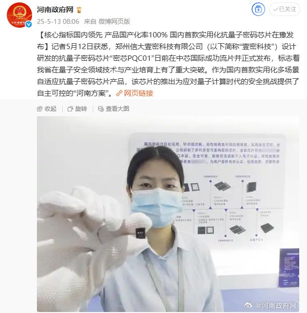 IT之家 5 月 14 日消息,综合河南政府网、河南日报消息,郑州信大壹密科技有限公司设计研发的抗量子密码芯片“密芯 PQC01”日前在中芯国际成功流片并正式发布,标志着我省在量子安全领域技术与产业培育上有了重大突破,该芯片也是国内首款实用化多场景自适应抗量子密码芯片产品。