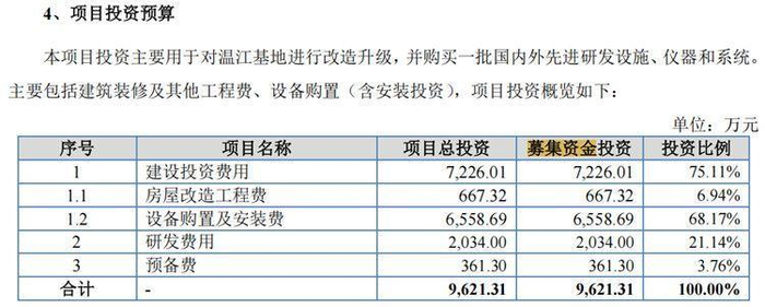 德芯科技募资的第三个项目是技术研发中心升级建设项目。该项目投资主要用于对温江基地进行改造升级,并购买一批国内外先进研发设施、仪器和系统。主要包括建筑装修及其他工程费、设备购置(含安装投资)。该项目总投资金额为9621.31万元,其中361.3万元用于预备费,占比为3.76%。