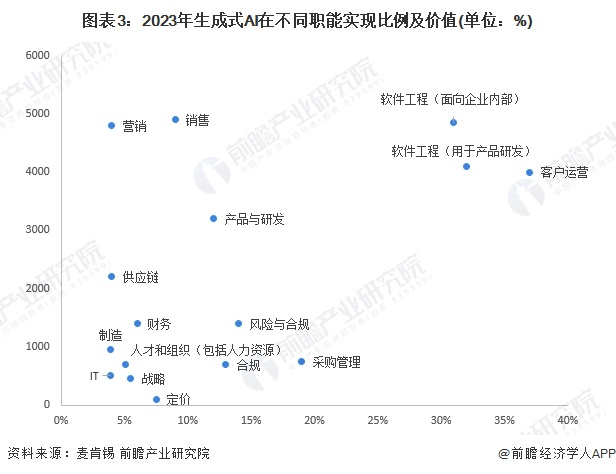 根据麦肯锡的一项调研报告数据,生成式AI在客户运营、营销和销售、软件工程和研发四大领域所创造的价值占到其年度总价值的75%,其应用渗透率较高。