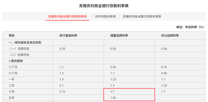 不过在本次统计中,记者发现了例外情况。无锡农商银行2025年5月公布的《无锡农村商业银行存款利率表》显示,三年期利率为1.70%,而五年期利率却为1.65%。