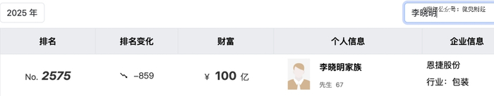受此影响,恩捷股份实际控制人李晓明家族财富严重缩水,根据胡润2025全球富豪榜单显示,李晓明家族以100亿位列第2575名,其较2021年巅 峰时期的725亿,财富缩水高达625亿元。