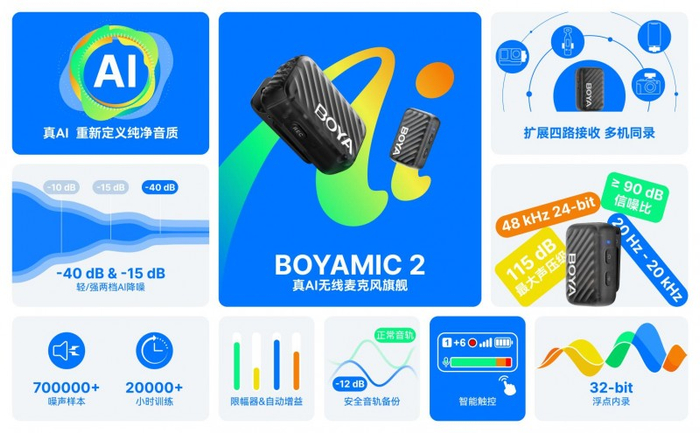 2025年5月14日,知名国产声学设备品牌 BOYA博雅,发布了两款革新性产品——真AI无线麦克风旗舰 BOYAMIC 2与真AI纽扣无线麦克风 BOYALINK 3。作为品牌年度重磅之作,两款产品均搭载 BOYA博雅自主研发的“AI深度降噪3.0”技术,以-40dB行业顶尖降噪深度、70万+噪声样本数据库及毫秒级实时处理能力,重新定义了无线麦克风的性能标准。此次发布不仅标志着 BOYA博雅在智能音频领域的又一里程碑,更预示着AI降噪技术正成为行业升级的核心驱动力。