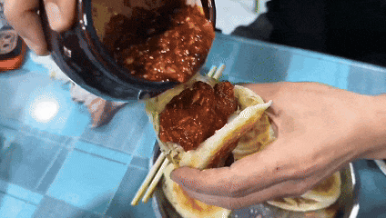 外酥里嫩的饼皮,内馅夹着熏肉,一口咬下去,香脆适口、香飘四溢。