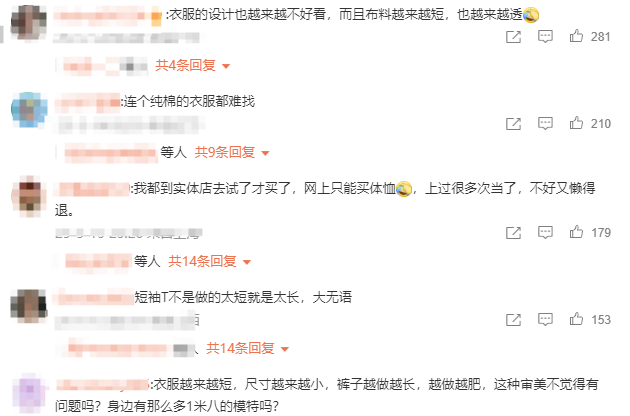 社交平台上弥漫着对“衣服越来越难买”的抱怨,行业内女装电商平均退货率已经达到五成以上。今天话题“为什么我们的衣服越来越难买了”冲上热搜榜。