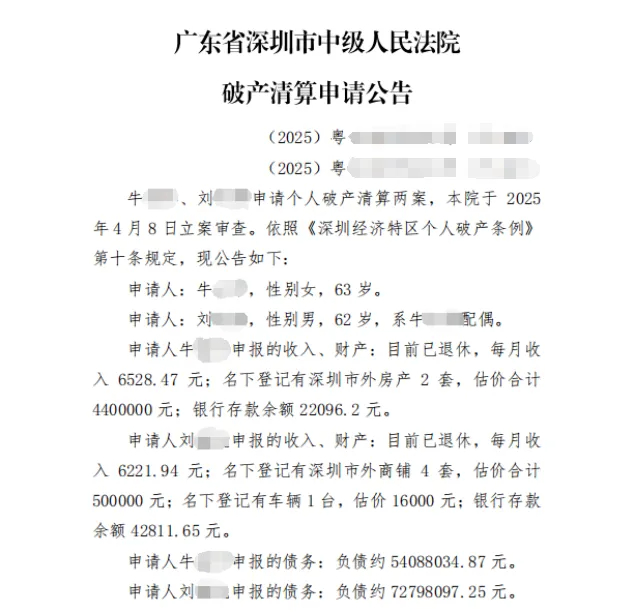 深圳市中级人民法院破产申请公告显示,63岁男子刘某和62岁的牛某为夫妻关系,两人均申报目前退休状态,其中妻子牛某申报每月收入6528.47元;名下登记有深圳市外房产2套,估价合计440万元;银行存款余额22096.2元。丈夫刘某每月收入6221.94元;名下登记有深圳市外商铺4套,估价合计50万元;名下登记有车辆1台,估价16000元;银行存款余额42811.65元。牛某申报的负债约54088034.87元,刘某申报的负债约72798097.25元,夫妻共同债务合计约126886132.12元。
